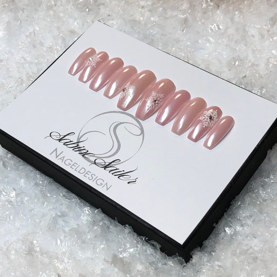 Winter Design Frosted Pink Chrome Ice White Snowflakes Swarovskis Handmade Artificial Fingernails Press On Nails